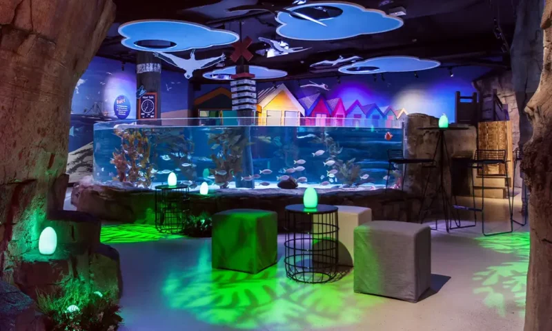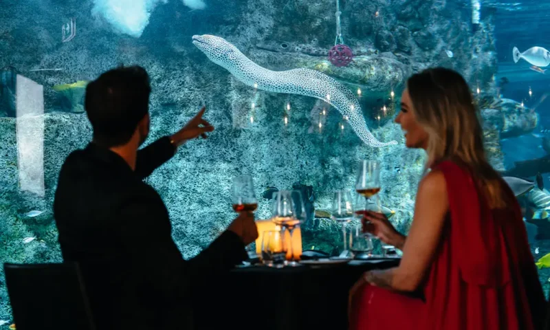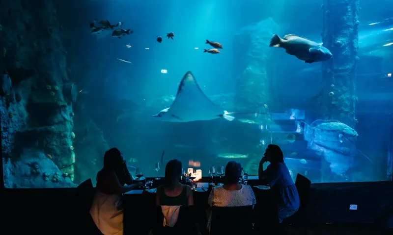 Immerse yourself in the immersive ambiance of our 360-degree tank surrounding the dining space, where every angle offers a glimpse into the wonders of the deep. With dimmable lighting features enhancing the atmosphere, your evening at the oceanarium promises to be an unforgettable journey into the heart of the sea. Book your extraordinary experience today.