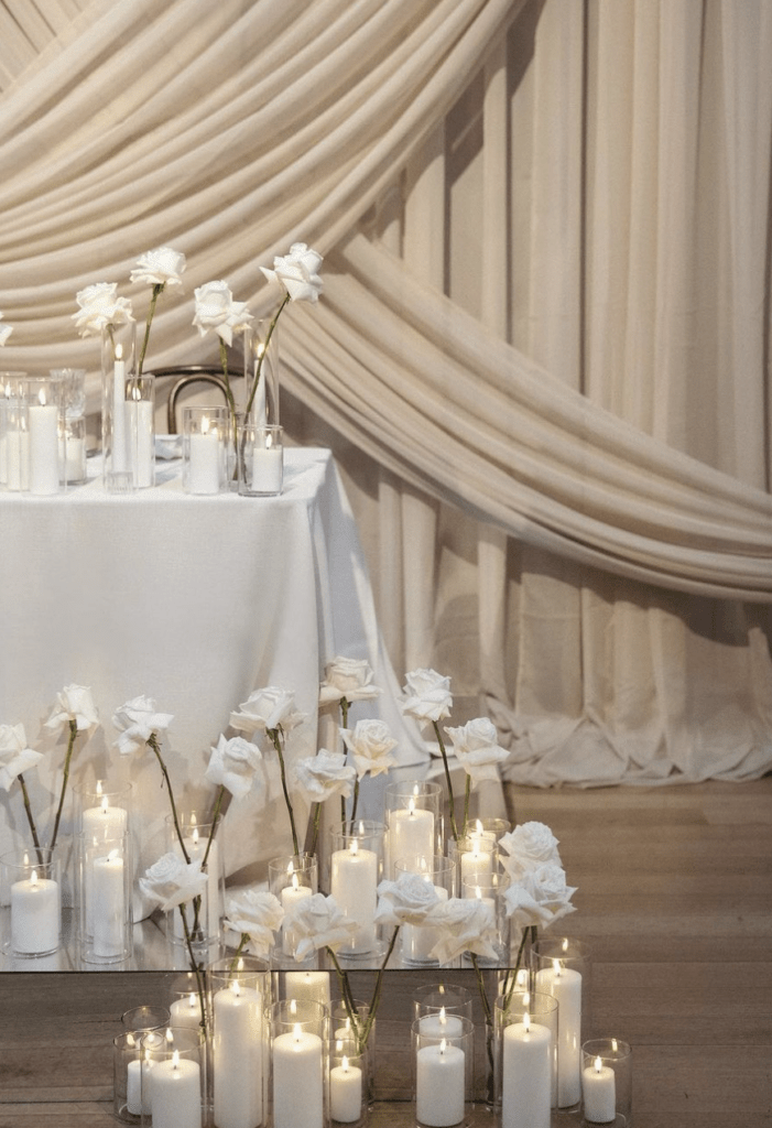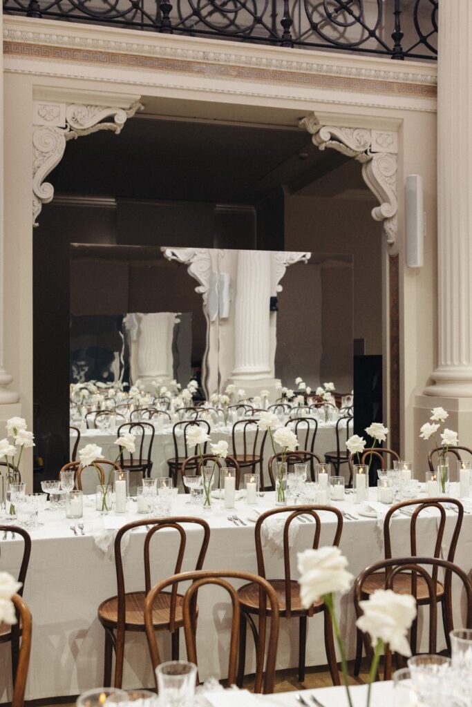 Previously closed to the public but now fully restored to its original heritage grandeur, the hall transformed into a mirage of delicate crystalware, white roses and ambient pillar candles – the perfect canvas for a party.