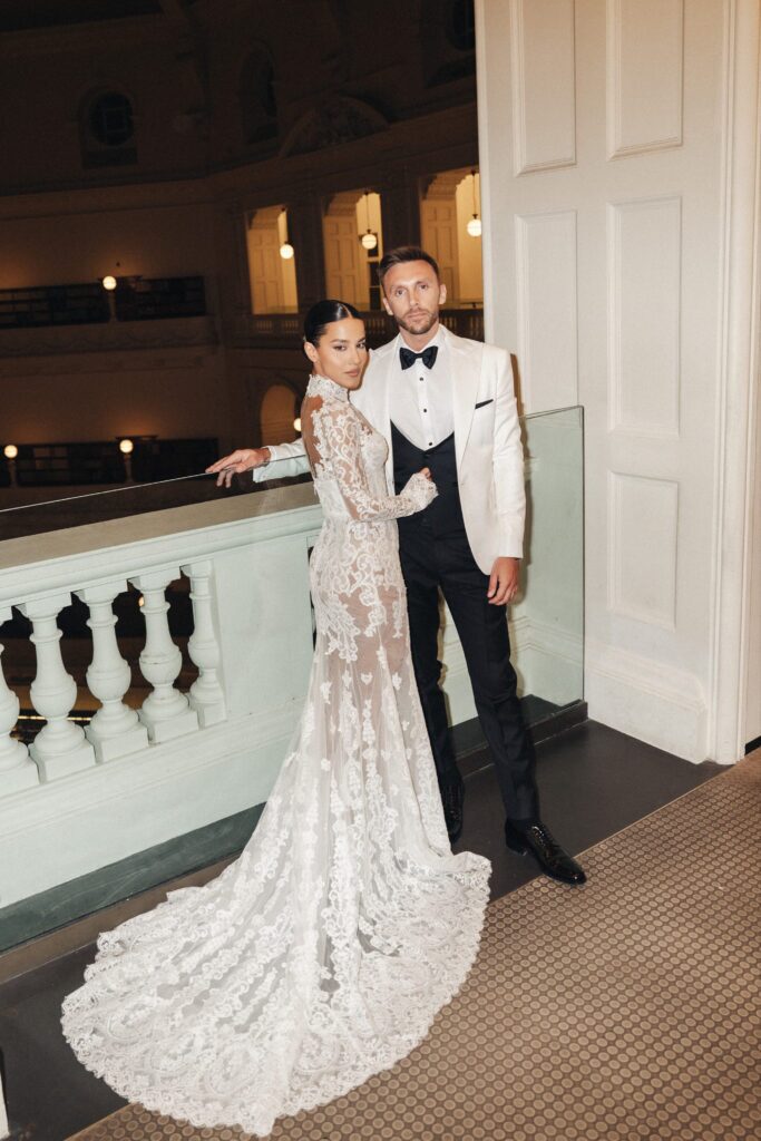 After exchanging vows at the altar, attendees were welcomed into the iconic State Library of Victoria’s Ian Potter Queen’s Hall for a traditional sit-down reception. The venue matched the romantic Parisian theme perfectly, with soaring Corinthian pillars, marble stairs, vaulted ceilings and timber parquet floors.